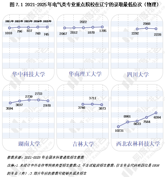 下图展现了部门985院校电气学类专业(物理)正在辽宁的登科环境。电气类顶尖985院校的热度有增无减。华南理工和西北农林科技大学门槛间接提拔,热度增加势头很是强劲;华中科大做为保守“电气四虎”之一门槛;川大、湖大、吉大2025年因扩招带来小幅回落,其报考绝对热度仍正在高位运转。正在扩招布景下,头部985院校电气类专业并未降温,合作都正在变得愈加激烈。