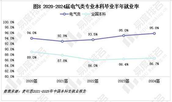 电气类专业不只是抢手,更是一个能经济波动、供给极高就业确定性的压舱石型专业。其就业率不只常年大幅领先全国本科平均程度,而且领先劣势还正在持续扩大。近两届就业率持续冲破95%,并且越来越需要。强大的就业韧性和奇特的市场所作力让其就业率正在所有专业类中排名第二。