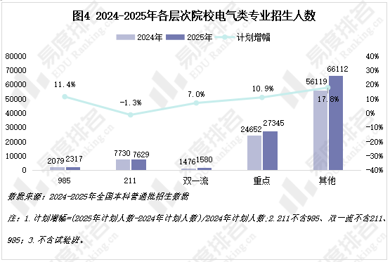 本年除了211高校以外各条理招生人数均有增加。其他院校扩招幅度最大,市场对于使用型人才需求兴旺,这为更多考生供给了攻读电气专业的机遇,但结业生也将面对更激烈的同条理合作。985院校增幅达到11。4%,扩招比例不低,但绝对数量添加不多,头部院校培育沉点不是规模扩张,而聚焦于国度计谋需求的尖端范畴,如智能电网、能源互联网、新型储能等。