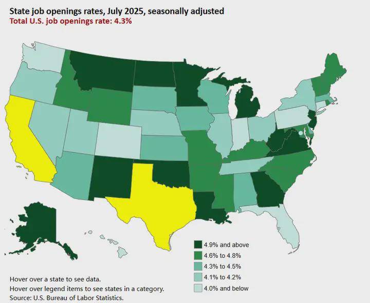 由于其劳动力基数极其复杂,两州加起来仍然有跨越130万个职位空白。这个数字,比很多排名靠前的“缺人州”的总就业生齿还要多。