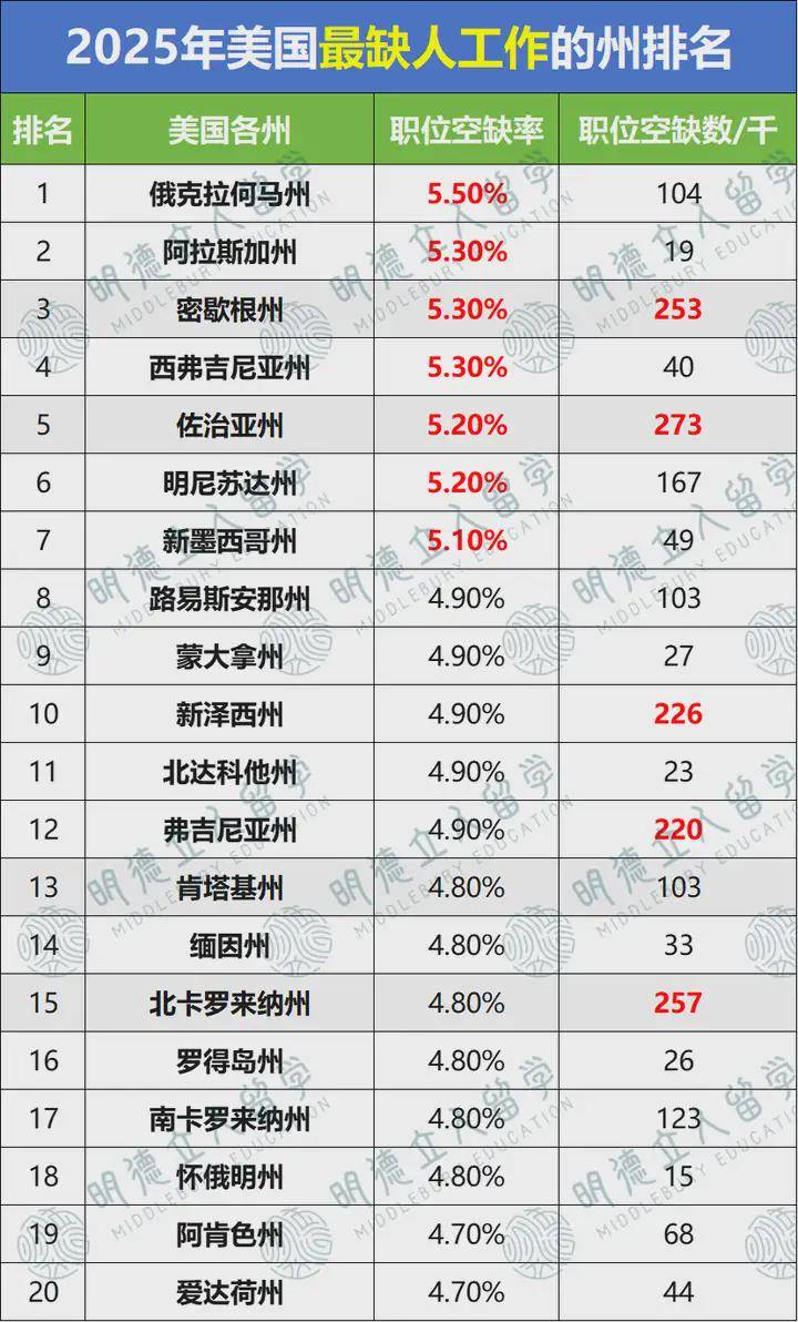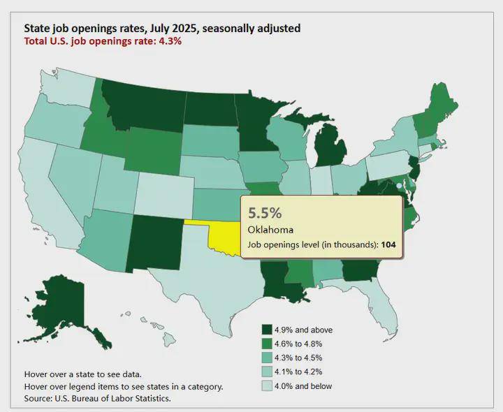 俄克拉荷马州位于美国中南部,以5。5% 的职位空白率拿下全国第一!跨越了持久劳动力欠缺的阿拉斯,缺口达10。4万!