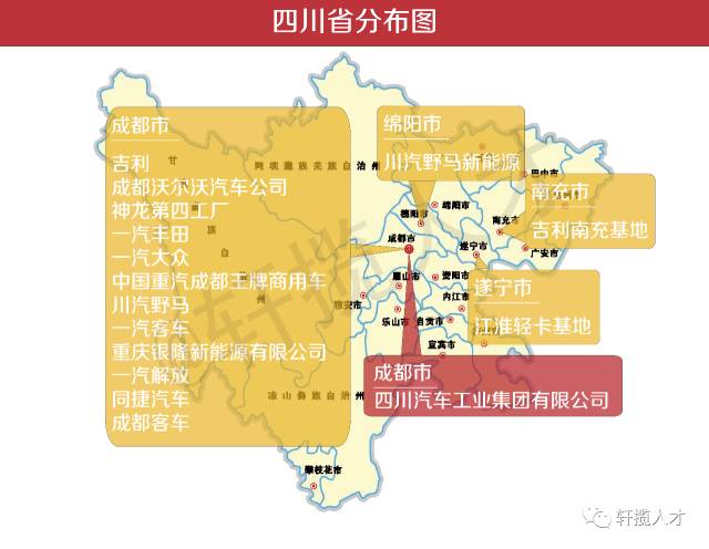 从这张分布图中能够看出,四川的车企出产制制核心次要集中正在成都这一块,成都的汽车财产次要集中正在龙泉驿何处,谈到成都的主要性,一汽公共汽车无限公司总司理安铁成已经说过:“成都是一汽公共继之后的第二个出产,它的建成对于一汽公共来说,其意义不只仅是产能的添加,更具有正在中国西部区域的计谋性感化。”