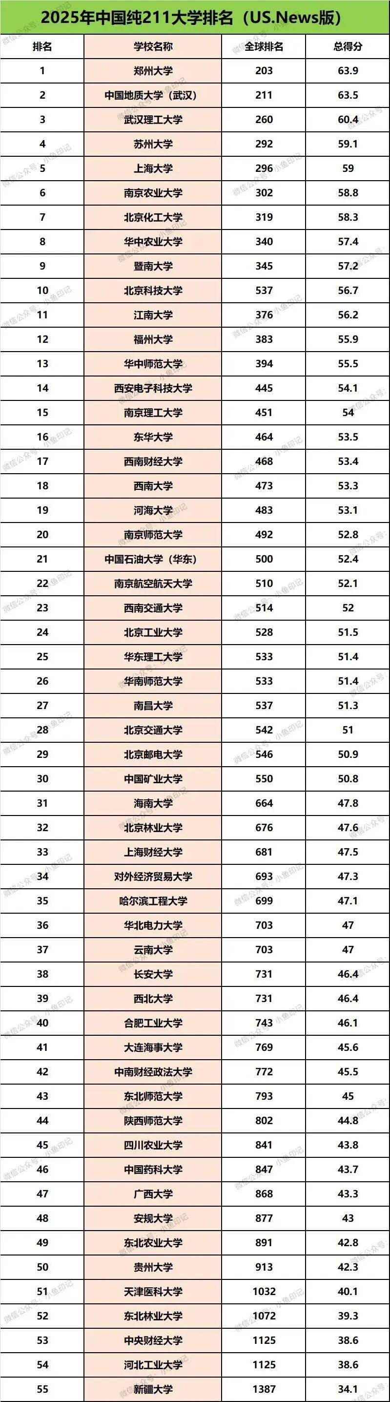 按照US。News供给的中国高校排行榜显示,中国211工程大学前三名别离是:郑州大学、中国地质大学(武汉)、武汉理工大学。
