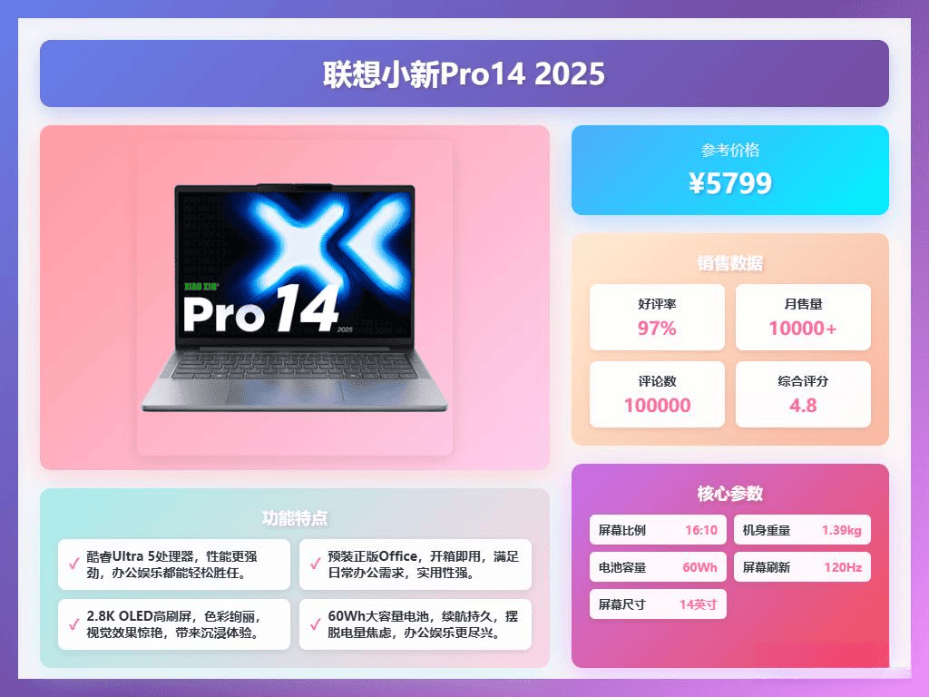 正在机能方面,联想小新Pro14 2025搭载了酷睿Ultra 5 225H处置器,共同32GB内存,日常办公和影音文娱都没有问题。散热设想也进行了升级,采用第二代猎鹰MAX电扇,风量更大,乐音节制得也不错。接口方面很是齐备,USB-A、Type-C、HDMI都有,扩展性很是好。硬盘为1TB的固态硬盘,速度很是快,而且支撑用户自行加拆一块硬盘。其他方面,这款笔记本的键盘手感优良,键程适中,回弹也很活络。摄像头支撑人脸识别,开机解锁很是便利。此外,物理防窥开关的设想也为现私加分。电池续航表示不错,而且支撑快充,不外具体续航时间还需按照小我利用习惯来决定。总的来说,今天保举的三款轻薄笔记本各有所长。机械14X正在机能和屏幕本质上表示超卓,适合对逛戏机能有必然要求的用户。华硕无畏16则正在平衡性方面表示优异,兼顾了机能和便携性。而联想小新Pro14 2025凭仗其超卓的OLED屏幕,无疑是影音快乐喜爱者的首选。若是你对屏幕显示结果有极致逃求,联想小新Pro14 2025的2。8K OLED屏幕绝对能满脚你的需求,色彩鲜艳、显示细腻,视觉体验很是棒。若是你需要兼顾必然的逛戏机能和日常办公,机械14X会是更好的选择,若是你逃求不变靠得住,同时沉视品牌口碑,华硕无畏16会比力适合,英特尔酷睿i5处置器应对日常利用绰绰不足,并且华硕的售后办事也相对完美。正在采办时,大师尽量选择京东自营或品牌旗舰店,如许能买到正品,售后办事也更有保障。拿到新笔记本后,记得及时激活系统和Office,日常平凡利用过程中留意散热,避免长时间正在高负载下运转,以耽误笔记本的利用寿命。此外,采办一份不测险,以防万一。但愿大师都能选到心仪的轻薄笔记本,让工做和糊口愈加轻松高兴!查看更多。