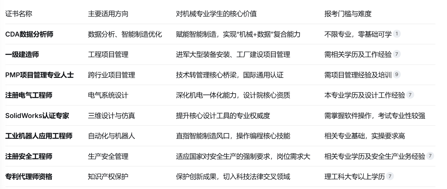 一级建制师是建建工程范畴的权势巨子认证,对机械专业学生价值奇特。更是参取大型工业厂房扶植、根本设备项目标通行证。跟着2025年国度新型城镇化扶植规划推进,市政工程人才需求暴增,机电专业持证人项目分红可达工程制价的3%-5%。注册电气工程师则是电气设想范畴的颠峰认证。正在制制业向智能化转型的布景下,机械取电气的一体化设想成为刚需。SolidWorks认证专家是机械设想范畴的实操型认证。做为全球支流的三维设想软件,SolidWorks的认证可以或许间接证明持证人的设想建模能力和工程问题处理程度。工业机械人使用工程师认证曲指从动化出产焦点。跟着“机械换人”趋向加快,控制工业机械人编程、和集成技术的人才求过于供。这一认证出格适合但愿正在汽车制制、电子产物拆卸等从动化程度高的行业成长的机械专业学生。PMP项目办理专业人士认证供给了手艺向办理转型的最佳径。它不局限于特定行业,供给了一套全球通用的项目办理尺度。华为、腾讯等科技巨头已将PMP认证纳入项目司理晋升查核系统。对机械专业学生而言,PMP认证能帮帮将来担任产物开辟项目或出产线项目时,成立系统化的办理思维,持证人项目金遍及可提高40%-。注册平安工程师已成为企业平安出产办理的标配。按照国度,矿山、建建施工单元和物品出产等高危行业,必需按比例配备注册平安工程师。对机械专业学生而言,这一证书既合适国度政策导向,又能切入企业平安办理这一主要岗亭,特别正在2026年及将来,平安出产将是企业成长的红线,持证人前景广漠。专利代办署理师资历则是手艺立异的法令兵器。机械设想取制制素质是立异勾当,发生大量可专利化的手艺方案。具有专利代办署理师资历的机械人才,既能更好地本人的立异,也能正在企业中担任手艺取法令的桥梁脚色,薪资待遇遍及高于纯手艺岗亭。正在校期间取结业初期(0-2年),应聚焦焦点技术认证:可考取SolidWorks认证专家(CSWP)和CDA数据阐发师LevelⅠ。这两项认证门槛相对较低,能快速提拔就业合作力,此中CDA数据阐发师LevelⅠ备考周期较短,适合正在校生进修走手艺专家线,可攻工业机械人使用工程师和注册电气工程师根本测验;走手艺办理线,则招考取PMP认证和CDA LevelⅡ。职业成熟期(5年以上),逃求行业权势巨子天分:可挑和一级建制师、注册平安工程师或专利代办署理师资历,这些证书往往需要必然工做经验堆集,