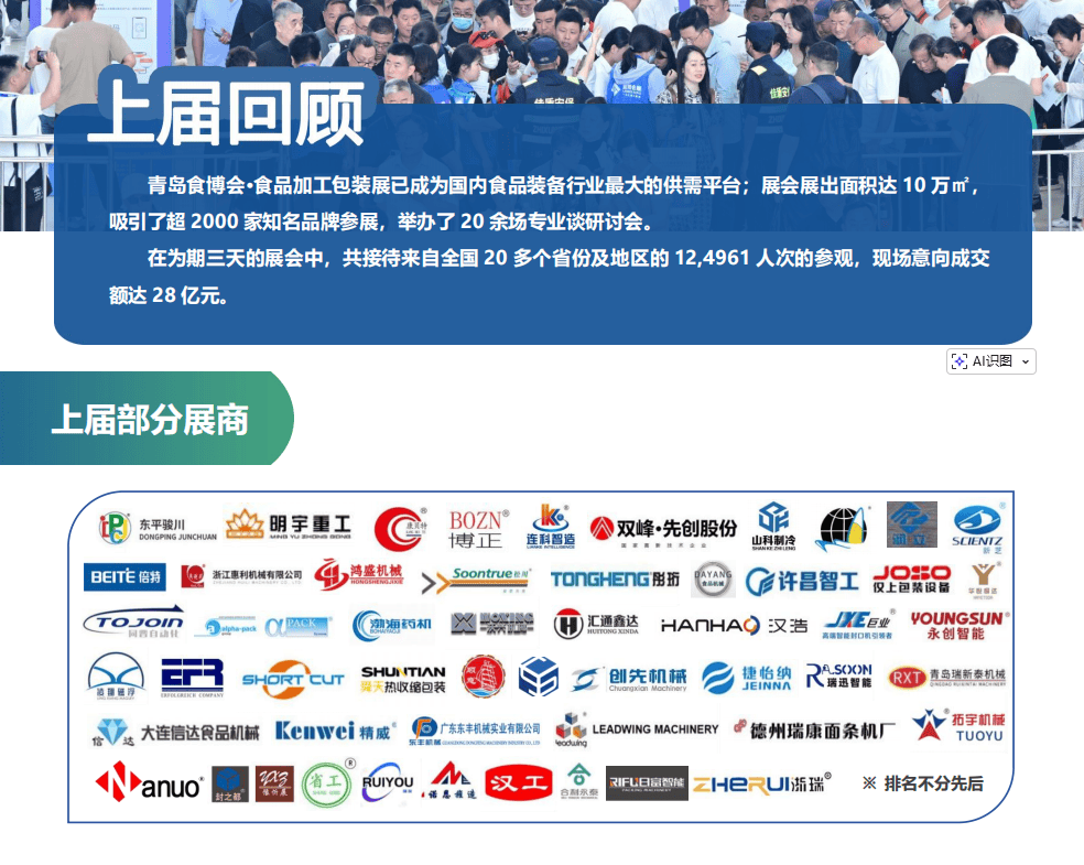 昌大举办。2026青岛食物机械展以“数智赋能食物财产,立异驱动包拆升级”为从题,汇聚全球食物加工取包拆机械范畴的最新手艺、是中国北方规模最大、影响力最强的食物机械行业嘉会。2026青岛食物机械展由食物工业协会结合从办,青岛蓝博国际会展无限公司承办,估计展出头具名积14万平方米,吸引2500+全球参展商,展出3000+项立异手艺及设备,涵盖食物加工、智能包拆、从动化出产线、冷链物流等全财产链处理方案。