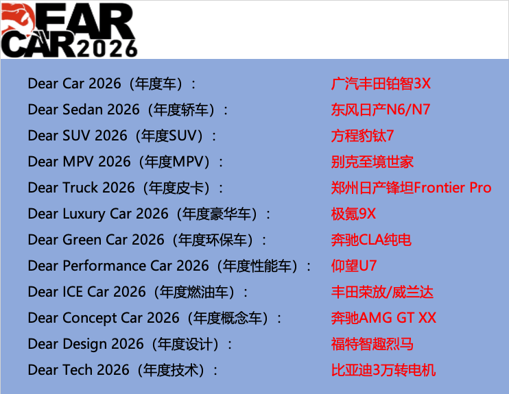 其时间的指针拨向2025年,汽车行业的竞赛从题已悄悄从单一手艺的“冲破”,改变为立异科技的“普及”取“融合”。本年“Dear Car 2026”的获名单,恰是这一趋向最活泼的注脚。实正的行业引领者,不再是炫技的孤怯者,而是那些能将最前沿的手艺思虑,为深受市场承认的产物体验的实干家。